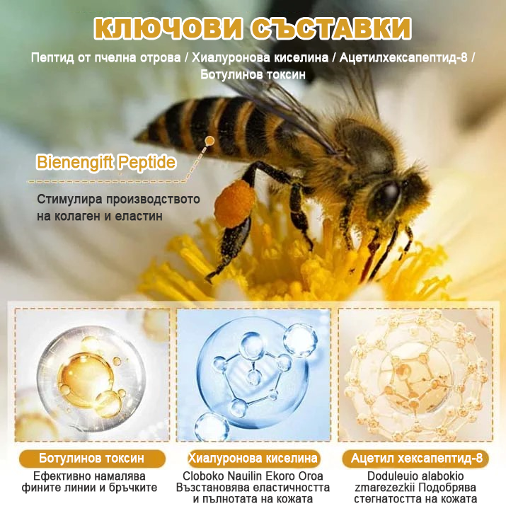 Пептиди от пчелна отрова: Пептидите от пчелна отрова имитират естествената реакция на кожата към микростимулация, стимулирайки производството на колаген и еластин. Това може незабавно да стегне и стегне кожата и временно да замъгли появата на бръчки.